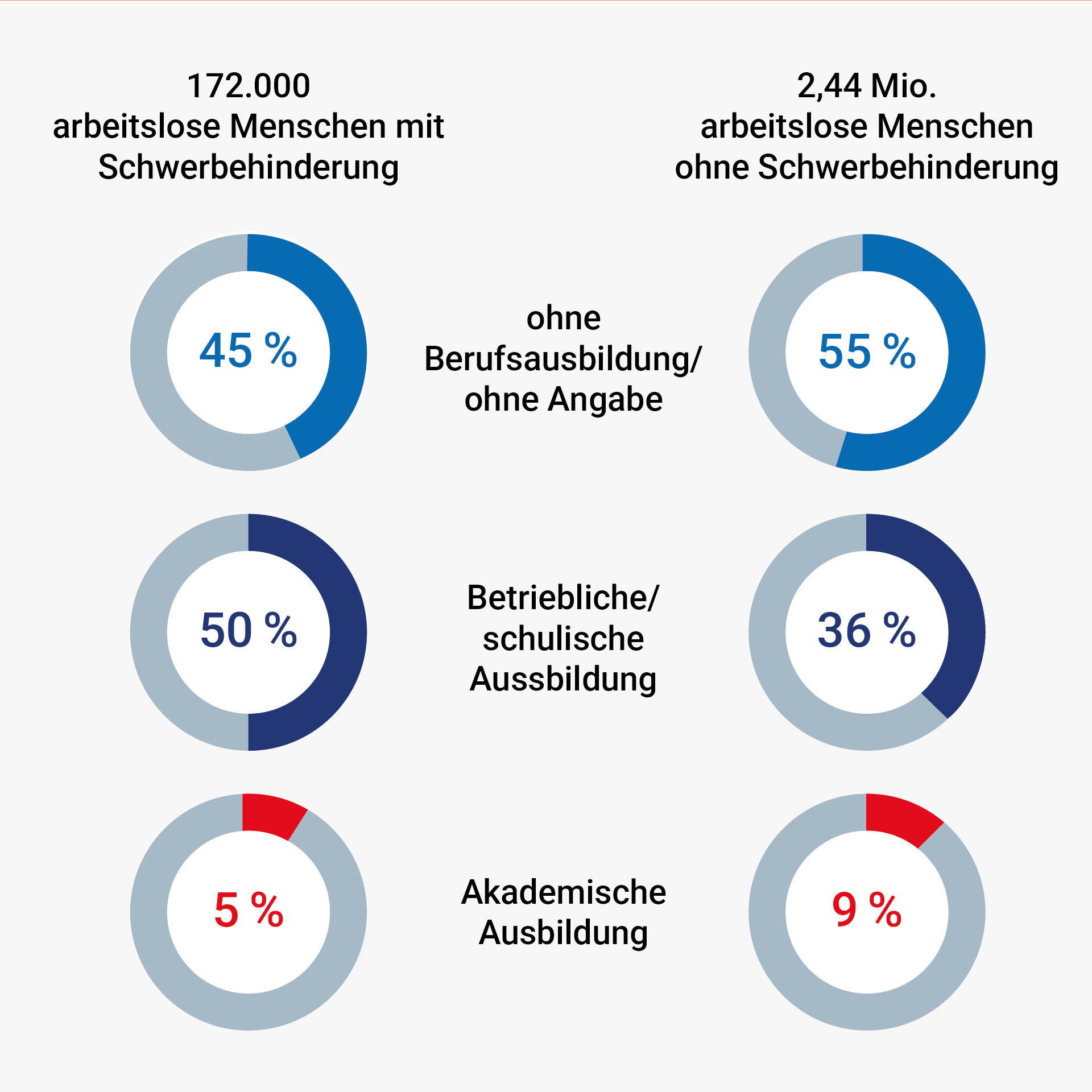 Arbeitslose Menschen mit Schwerbehinderung haben deutlich öfter eine betriebliche und/oder schulische Ausbildung als Menschen ohne Schwerbehinderung. Im Durchschnitt sind Arbeitslose mit Schwerbehinderung daher etwas höher qualifiziert als Arbeitslose ohne Schwerbehinderung, wie die folgenden Diagramme (Bundesagentur für Arbeit, 2022) zeigen.